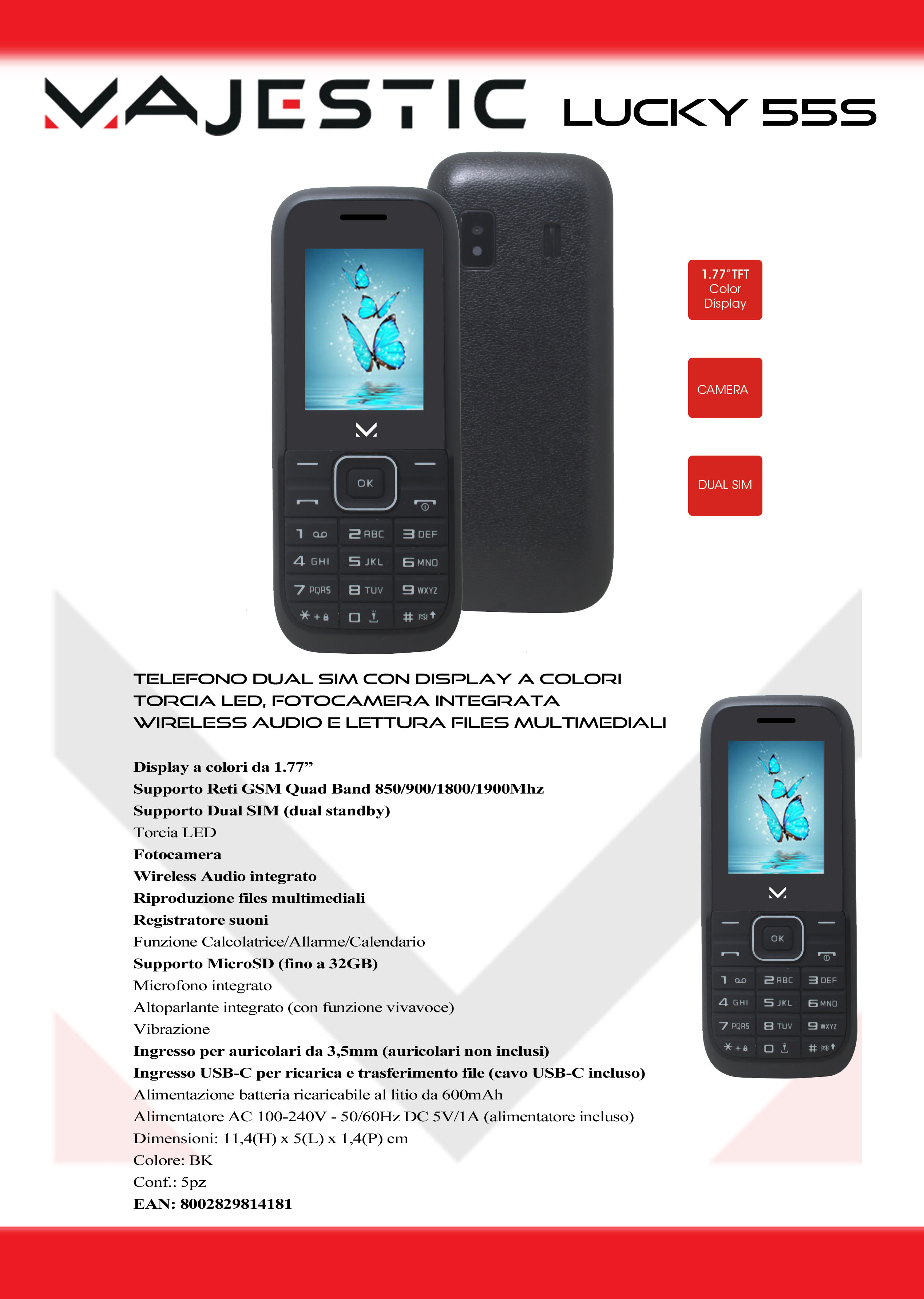 Il nuovo MAJESTIC LUCKY 55S è il telefono ideale per chi cerca praticità e semplicità senza rinunciare alle funzioni utili di tutti i giorni. Grazie al supporto Dual SIM, puoi gestire due numeri nello stesso dispositivo: perfetto per chi vuole separare lavoro e vita privata oppure sfruttare due tariffe diverse.