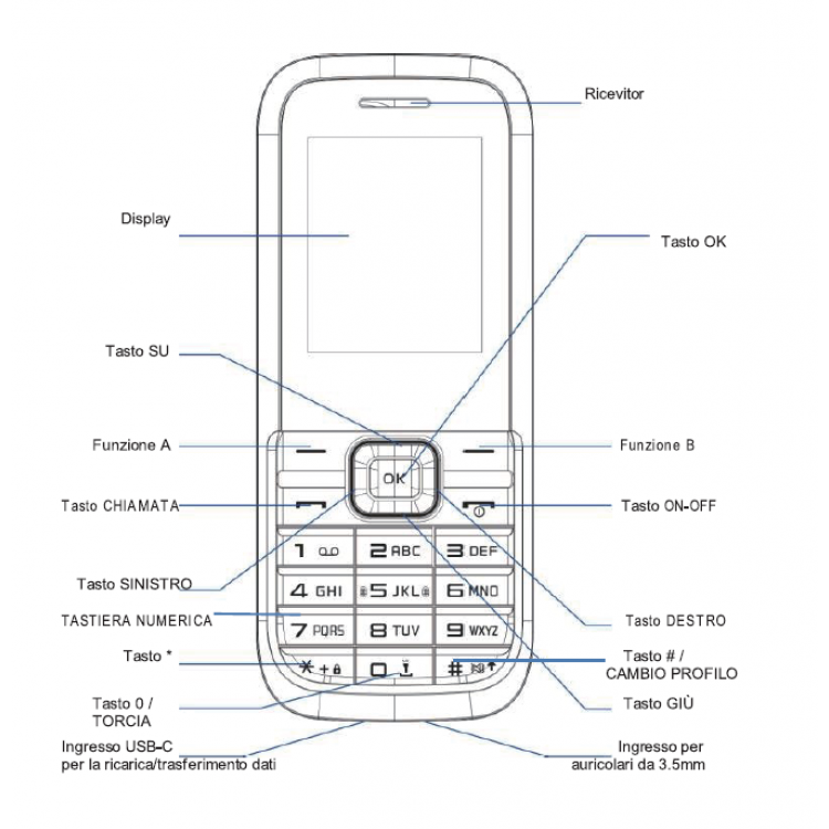 Tra le funzioni trovi la torcia LED, la fotocamera, la possibilità di ascoltare musica o registrare note vocali, oltre al supporto per schede MicroSD fino a 32GB. Con ricarica tramite USB-C e batteria al litio, questo telefono unisce affidabilità e semplicità, diventando il compagno perfetto per la vita quotidiana.